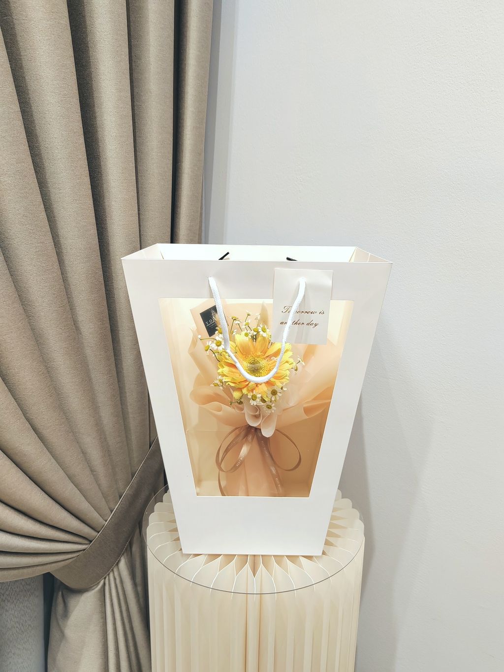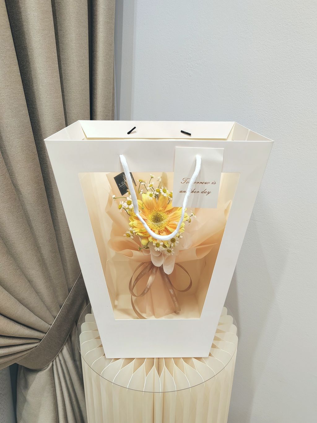 *Photos are for illustration only. Kindly note that, this product does not come with and flower or flower bouquet. Any flowers or bouquet show in the photos are as a guide for the floral gift bag sizes only.